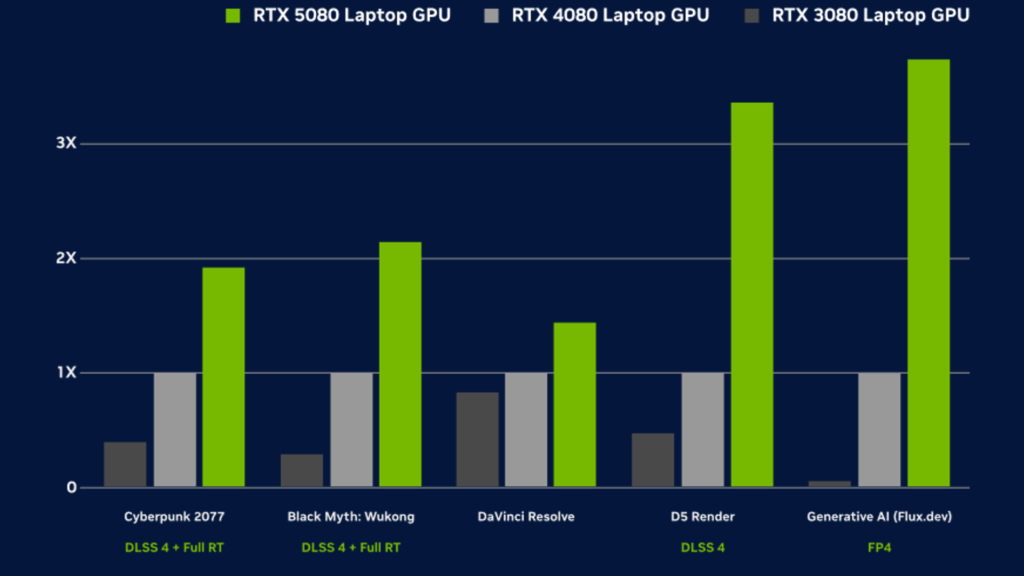 RTX 4090 Laptop→5090 Laptopの伸び幅は1.6〜2.0倍以上と見られています。